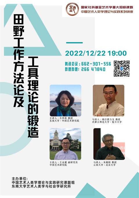 2022年12月22日晚19:00,國家社科基金藝術(shù)學(xué)重大招標課題“中國藝術(shù)人類學(xué)的理論與實踐研究”系列講座第八場順利舉辦。面對藝術(shù)人類學(xué)國外先進理論和經(jīng)驗引進國內(nèi)后,如何內(nèi)化為符合我國本土田野藝術(shù)和田野實踐需要的工具、理論和方法,本期講座特邀請東南大學(xué)首席教授、中國藝術(shù)研究院藝術(shù)學(xué)研究所名譽所長方李莉教授,進行了題為《田野工作方法論及工具理論的鍛造》的講座。為達到更好的效果,同時邀請納日碧力戈教授和朱曉陽教授為本次講座的與談嘉賓。本次講座由國家社科基金藝術(shù)類重大項目“中國藝術(shù)人類學(xué)的理論與實踐研究”課題組主辦,通過騰訊會議和嗶哩嗶哩直播平臺同步直播,累計觀看人次800有余,線上互動氣氛熱烈,交流效果斐然。