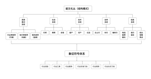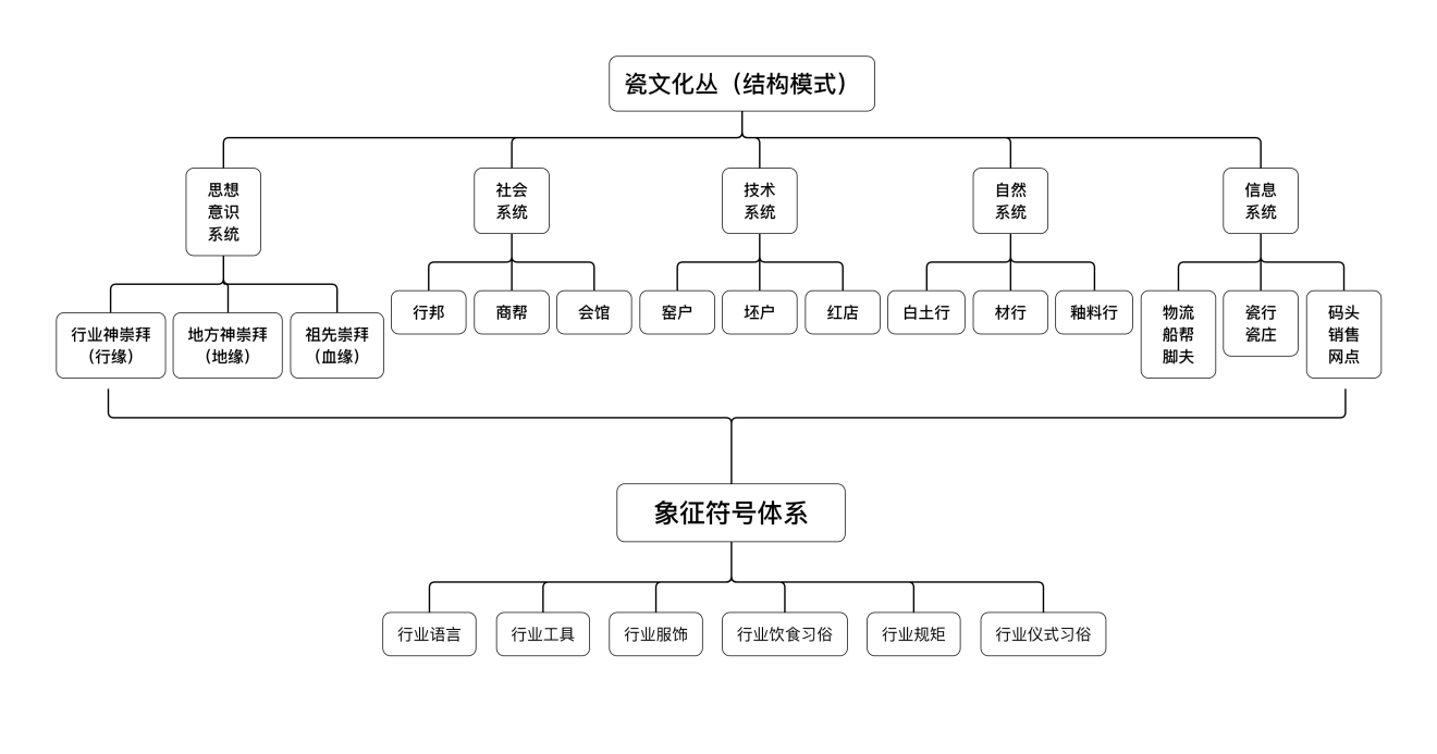 (4)瓷文化叢。這是方李莉教授在自己的田野研究中所鍛造的一個理論工具,其在研究中,把景德鎮(zhèn)的陶瓷業(yè)作為一種“文化形式”來研究。按照人類學(xué)的解釋,一個部落文化包括許多的單位,這就是文化特質(zhì)。研究者入手時必須要以一個特質(zhì)為工具,這些特質(zhì)并不是簡單的一件事物,它必須有許多附帶的東西合成一個“文化叢”。這里將陶工們的造物方式劃分為一個“瓷文化叢”,其載體不是一個部落,而是一個行業(yè),通過制瓷行業(yè)生產(chǎn)而附帶出各種事件的結(jié)合體。“瓷文化叢”深入到依賴其所生存的人們的生活中的方方面面,不僅包括它的生產(chǎn)方式、宗教崇拜、行業(yè)規(guī)則、禁忌和習(xí)俗等,甚至還包括了衣、食、住、行等生活的細節(jié)方面。這里除了有空間的尺度之外,還包含了時間的尺度。因此“瓷文化叢”概念是動態(tài)的,不是扁平靜態(tài)的快照,而是有動態(tài)情境的影片。“瓷文化叢”作為一個動態(tài)的模式,其形成過程中存在4個變量:一是自然環(huán)境的變量,二是與自然、社會互動的生產(chǎn)方式,三是市場與外部世界互動的消費模式。四是社會條件,也就是國家時局、國際格局。這四個方面是社會發(fā)生變化的重要的變量,這些變量形成了“瓷文化叢”的動態(tài)發(fā)展過程。
