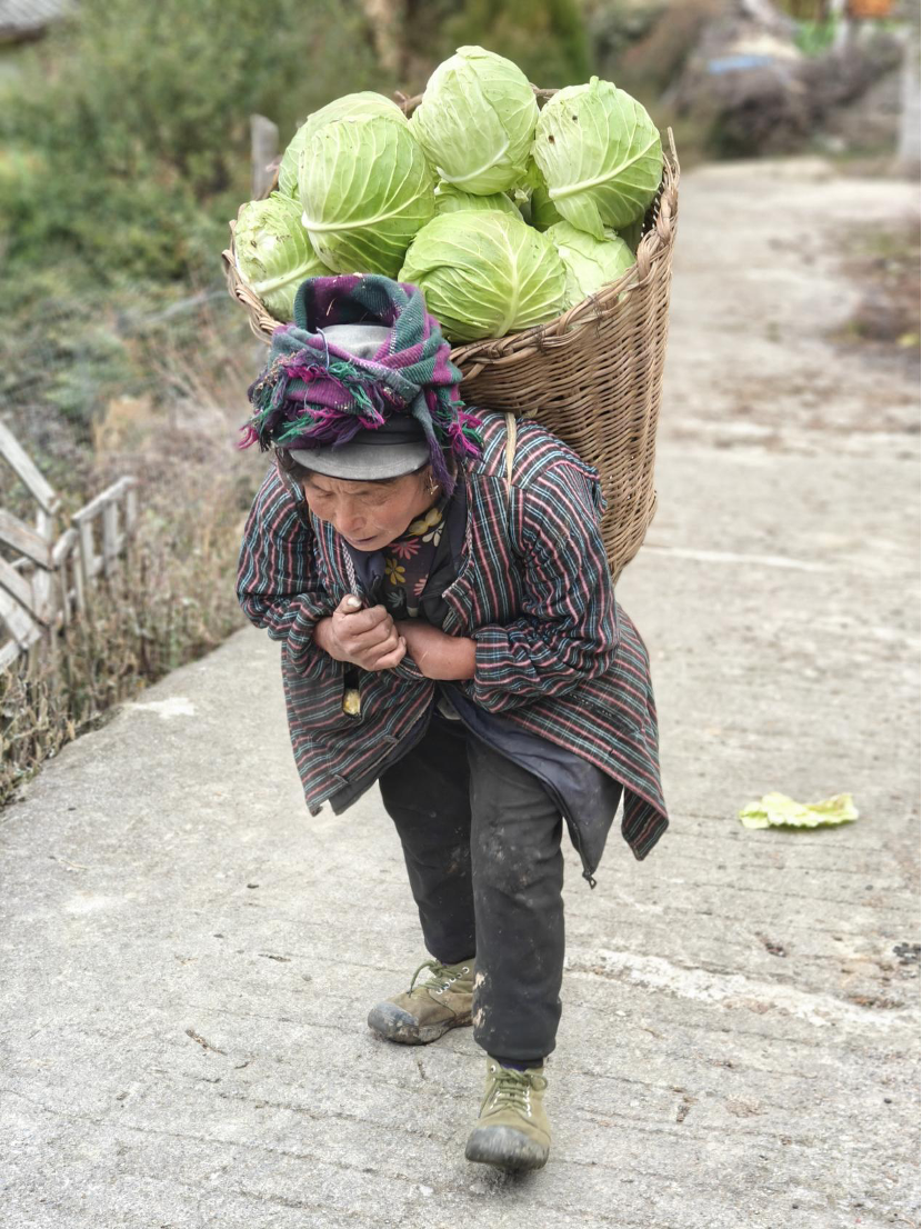 路上背包菜的村民