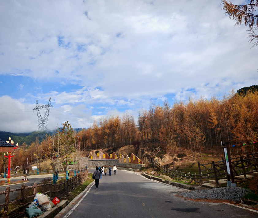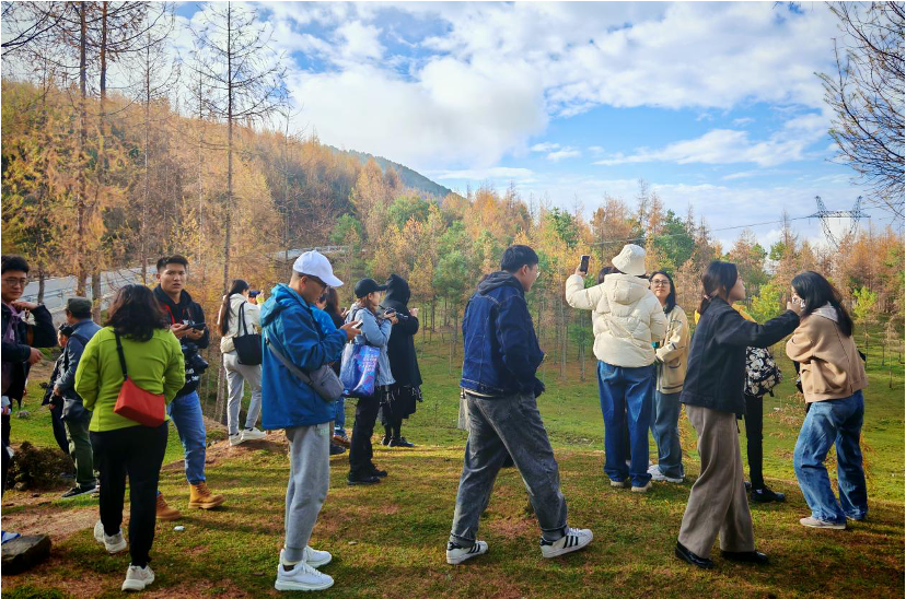 上午10點(diǎn),工作坊師生團(tuán)隊(duì)到達(dá)美姑井葉特西鄉(xiāng)的黃茅埂索瑪花景區(qū)進(jìn)行田野自由考察。黃毛埂索瑪花景區(qū)坐落于美姑縣縣城東北,距離縣城20公里,海拔2600米,總面積106平方公里,獲評(píng)國(guó)家3A級(jí)旅游景區(qū)。秋天的黃茅埂景區(qū)猶如一幅絢麗的畫卷,大巴車剛剛到站,大家就紛紛投進(jìn)自然的懷抱,感受自然的風(fēng),贊嘆秋葉的美,這里群山連綿、云海翻騰、美不勝收,大家都高興的拿出相機(jī)與自然合影。