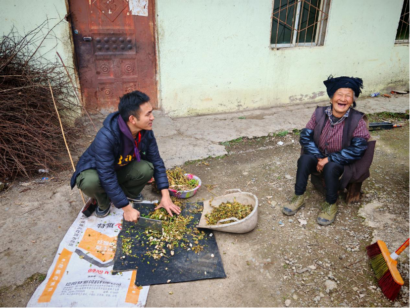 “今天在井葉特西古村落里,我們遇到了一位獨(dú)居老人,我們到的時(shí)候,同行的曲畢同志正在幫老人剁豬草,他告訴我們他來(lái)的時(shí)候看到老人在剁豬草,一下一下的很吃力的進(jìn)行著,他看著不忍心就接過(guò)了老人的菜刀幫助她,原來(lái)那把刀很鈍,而且那些草是干的,他砍起來(lái)也很吃力,更何況是一個(gè)年過(guò)七旬的老人。老人很慈祥,問(wèn)我們們來(lái)自哪里,有沒(méi)有吃飯等等,她開(kāi)心的和我們交談著,臉上掛著慈祥的笑容。也許看到我們她就想起了自己的孫兒孫女們。正像我們一樣,看著老人,想起來(lái)了自己的奶奶。”