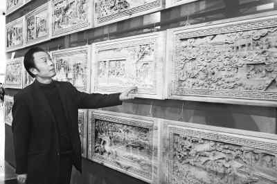 經(jīng)營廠子之外,杜新士也有自己的一些追求。比如,他立心要創(chuàng)作兩套花板,分別表現(xiàn)《三國演義》和《紅樓夢》的故事,每套各240塊,人物造型、場景環(huán)境都由自己來設(shè)計,當(dāng)然,這種費時費力的活兒并不好干,至今還只是未完成的方案。“《三國》雕了70來塊,《紅樓》雕了40來塊,離目標(biāo)還遠,也許還有個6年時間,就差不多了吧。”在農(nóng)展館的展廳里,杜新士展出了這些未完成的系列花板,一幅幅刀工細膩,構(gòu)圖精巧,讓人感嘆這其中蘊藏著的匠心。