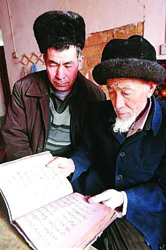 吐魯番鄯善縣魯克沁鎮(zhèn)宗教人士在翻閱察合臺語長篇敘事詩《熱吾澤突孜左合熱》手稿。?。ㄙY料圖片)