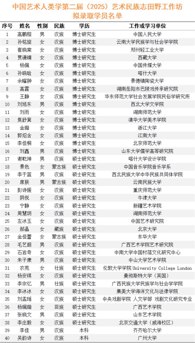 依照本項(xiàng)目的招生要求和培養(yǎng)目的,本著“擇優(yōu)錄取、統(tǒng)籌兼顧”的原則,經(jīng)項(xiàng)目組組織專家評(píng)審,現(xiàn)將40位擬錄取學(xué)員名單進(jìn)行公示。