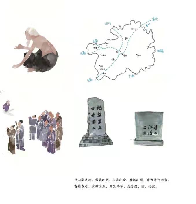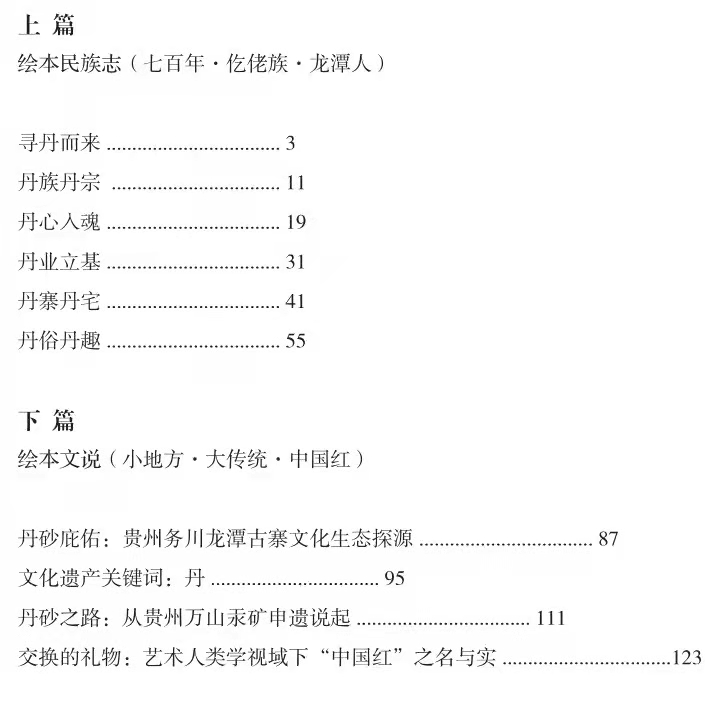 繪本部分包括“尋丹而來(lái)”“丹族丹宗”“丹心入魂”“丹業(yè)立基”“丹俗丹趣”五個(gè)單元。每一組圖像都不是浮光掠影的風(fēng)俗獵奇和符號(hào)捕殺,而是我和弟子姜麗通過(guò)長(zhǎng)時(shí)間參與觀察,同村民共同構(gòu)思創(chuàng)作,將龍?zhí)度说挠洃浥c現(xiàn)實(shí)通綴、符號(hào)和象征疊合,意圖傳達(dá)族群文化之“不易”“變易”“常易”的研究思考。比起那些晦澀而哲學(xué)的大師圖本,我們希望繪本民族志能做到質(zhì)而不俚,淺而能深,進(jìn)而能遠(yuǎn)。它可以是一本旅行隨身書(shū),帶你見(jiàn)人之未見(jiàn),領(lǐng)略“最具魅力民族村寨”的月夕花朝;它可以是一本別樣的村史,寓鄉(xiāng)情于圖景,記錄“中國(guó)歷史文化名村”的源深流長(zhǎng)。