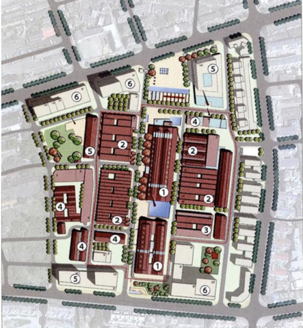 有了以上的規(guī)劃與設(shè)計(jì)定位,陶溪川在功能區(qū)劃上力求合理、高效,實(shí)現(xiàn)業(yè)態(tài)混合搭配,功能齊全的目標(biāo)。由圖二可知陶溪川藝術(shù)區(qū)內(nèi)的功能區(qū)位分布為:1.景德鎮(zhèn)陶瓷工業(yè)遺產(chǎn)博物館;2.大師工作室;3.陶瓷燒制服務(wù)中心;4.餐飲商業(yè);5.酒店客棧;6.辦公區(qū)域。這樣的功能分布將陶瓷文化的產(chǎn)業(yè)鏈置于藝術(shù)區(qū)的核心地帶,使博物館展示,陶瓷制作,陶瓷燒制,陶瓷銷售實(shí)現(xiàn)連動(dòng)發(fā)展,凸顯了陶溪川藝術(shù)區(qū)的陶瓷文化創(chuàng)意街區(qū)的品牌特色。